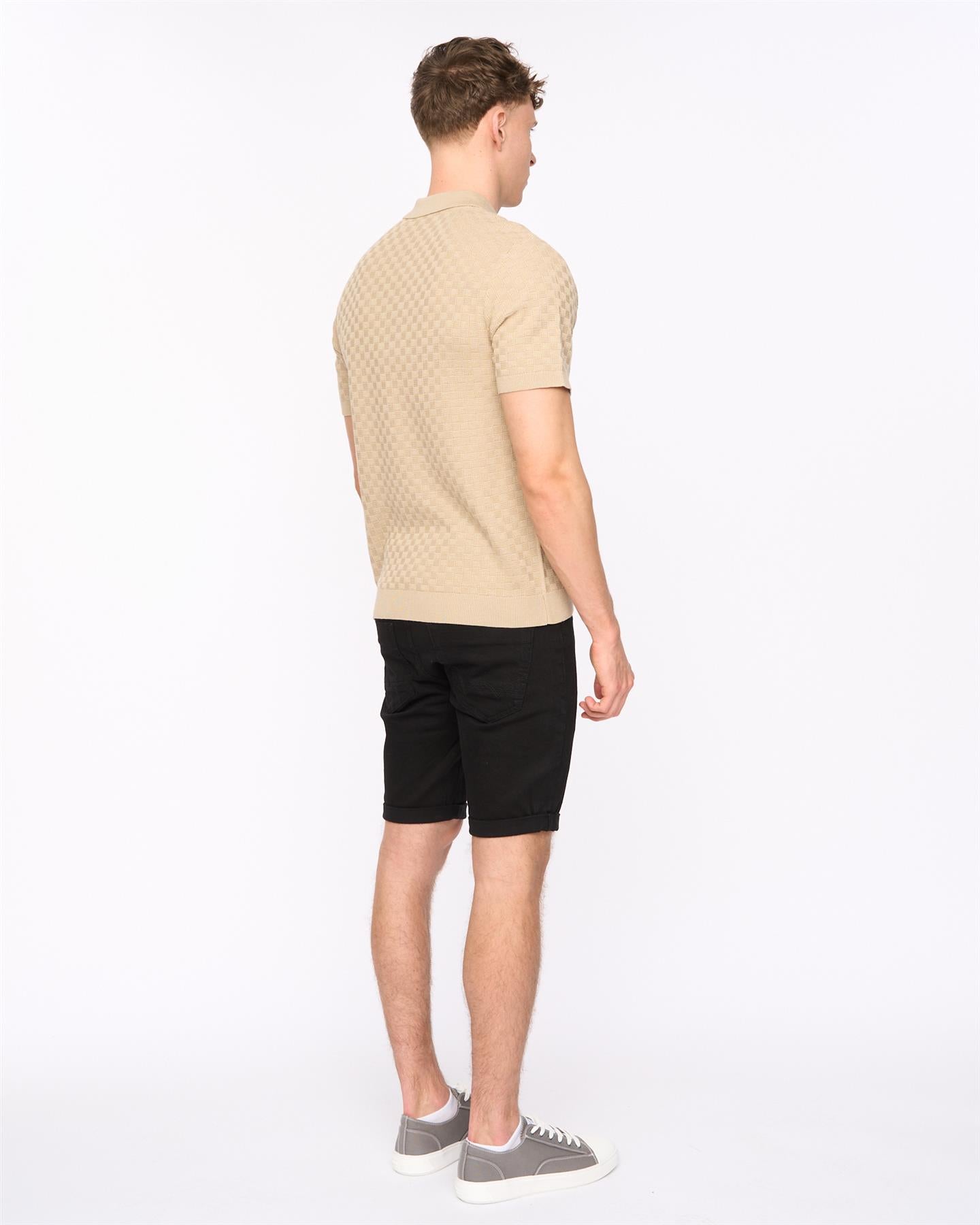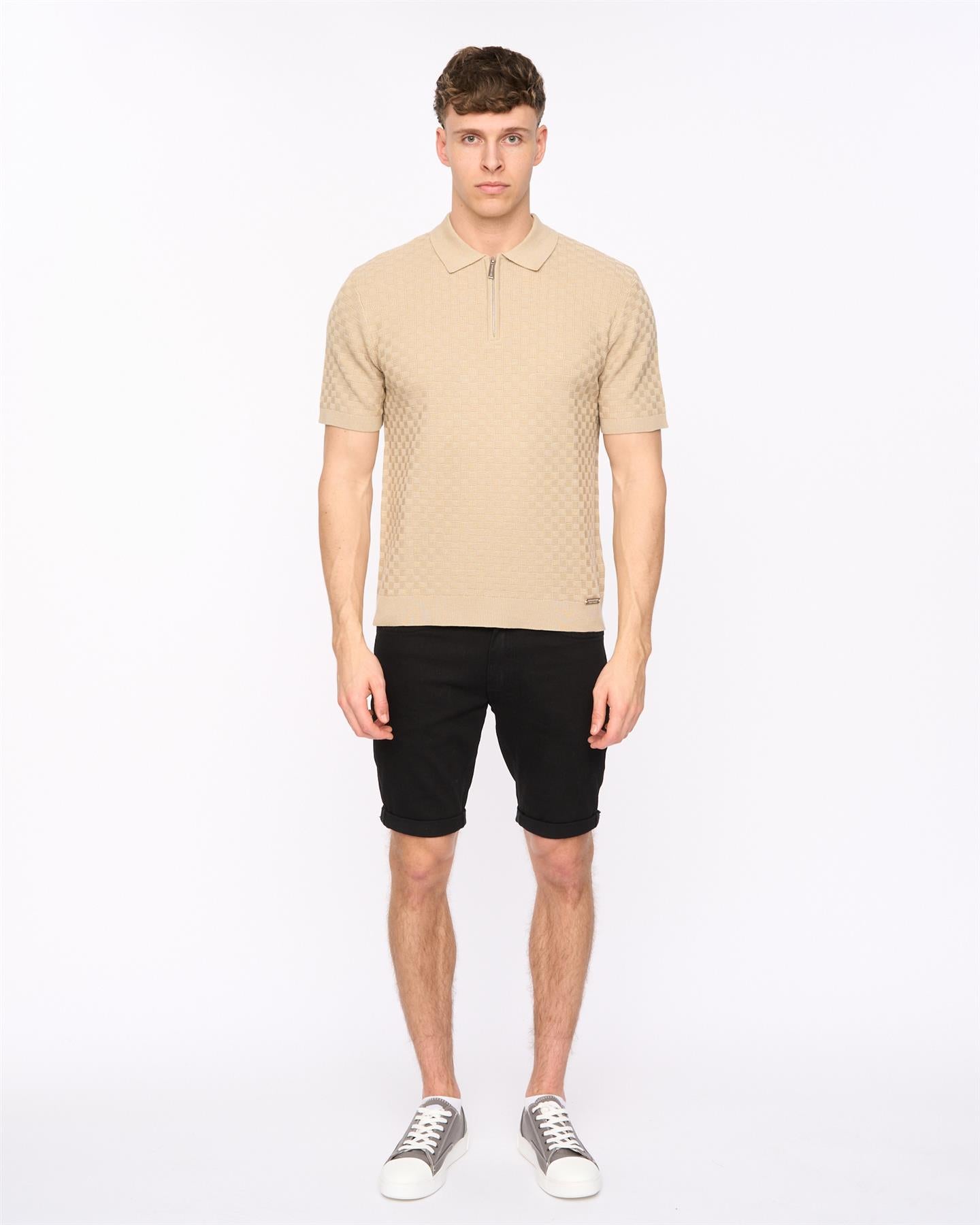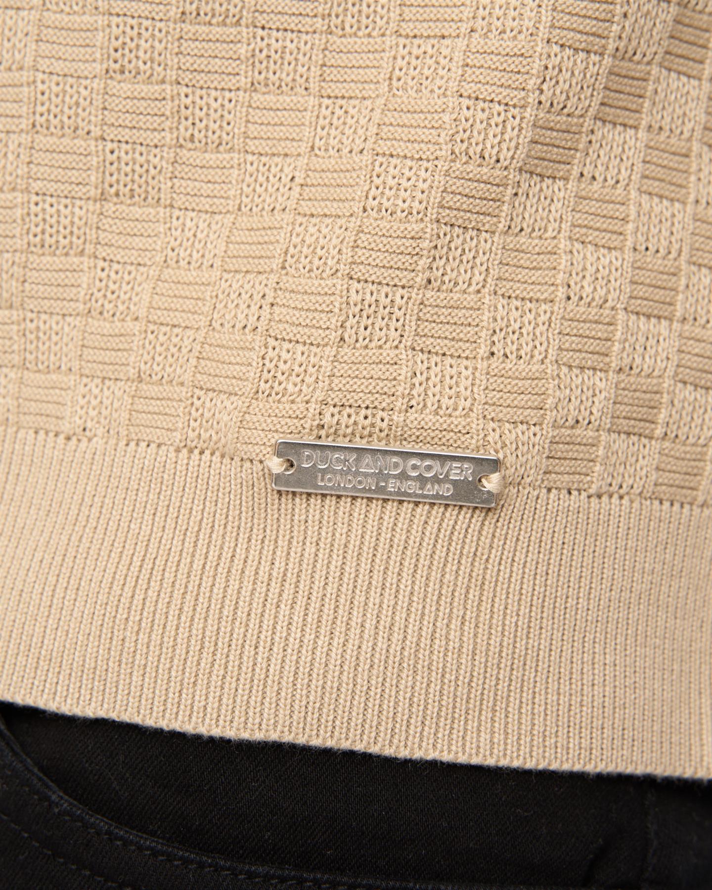 A modern knitted zip polo from Duck and Cover featuring a basket weave pattern for a clean, textured look. Finished with a branded quarter zip and ribbed trims, it offers a sharp option for everyday wear.