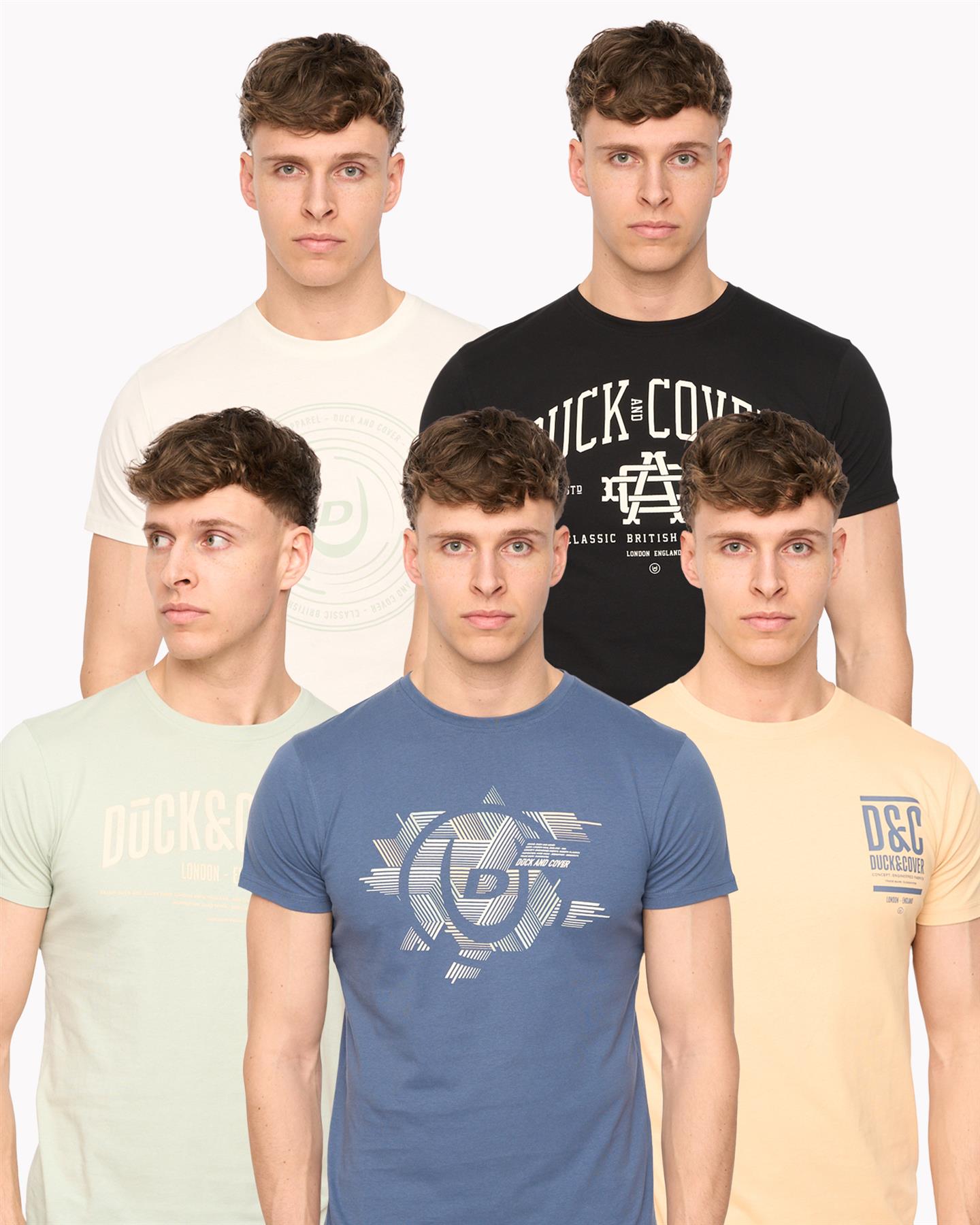 A 5-pack of cotton T-shirts from Duck and Cover, designed for everyday wear. Featuring self-fabric inner back neck tape and soft-touch prints across the collection, offering versatile styling options.