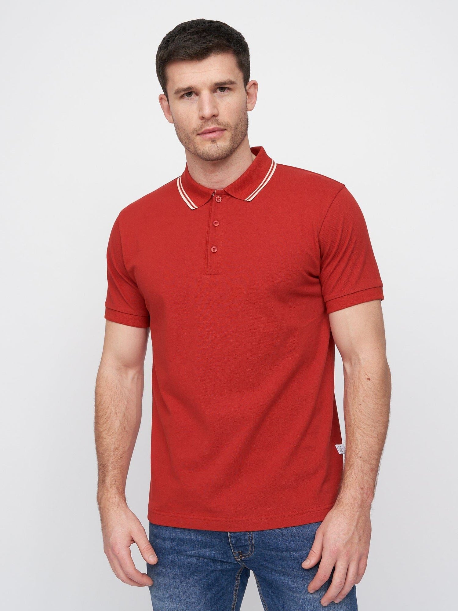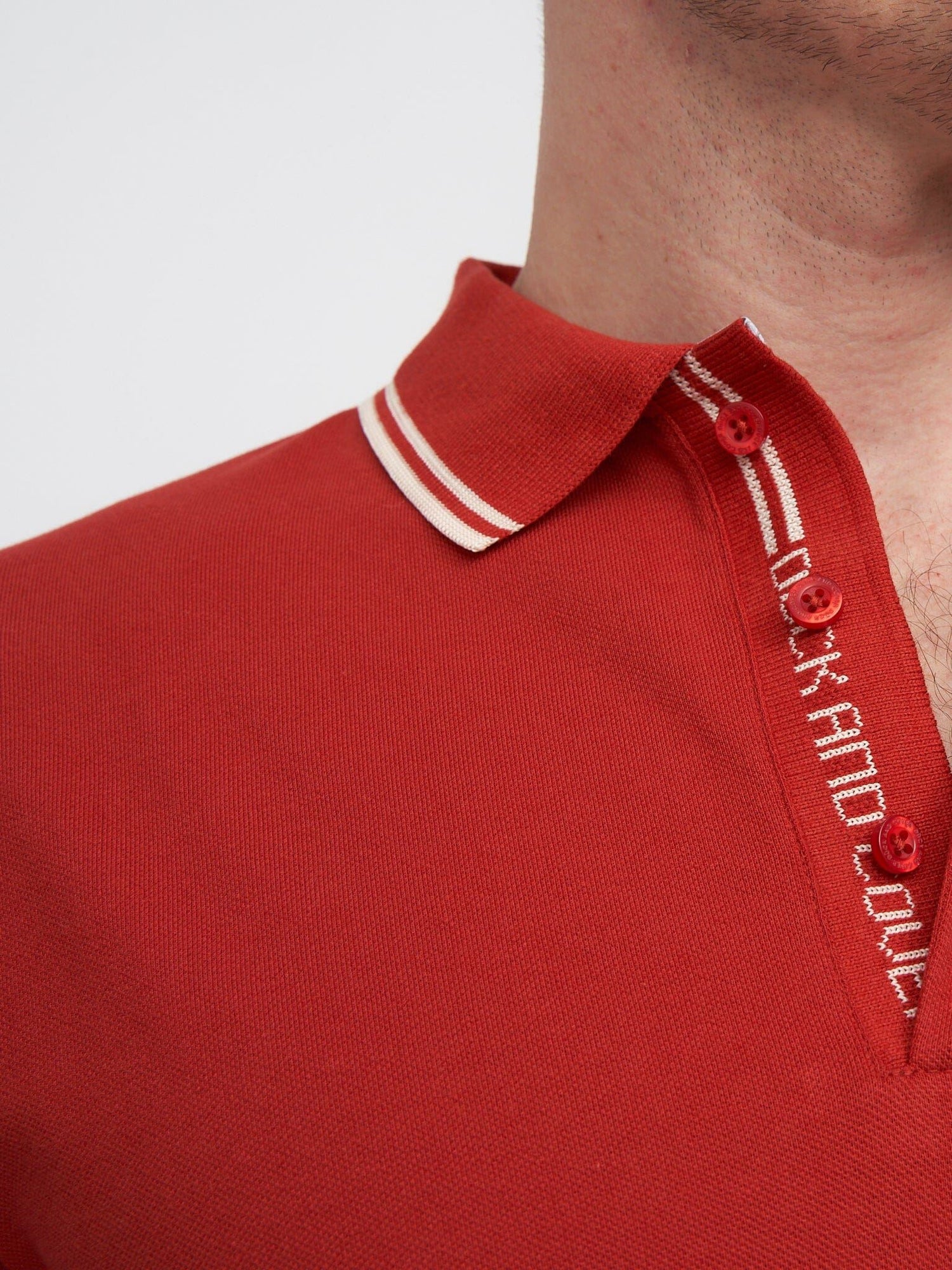 Men's pique polo with contrast tipping detail and 1x1 ribbed under placket with jacquard knitted branding feature and woven loop fold label to side hem.